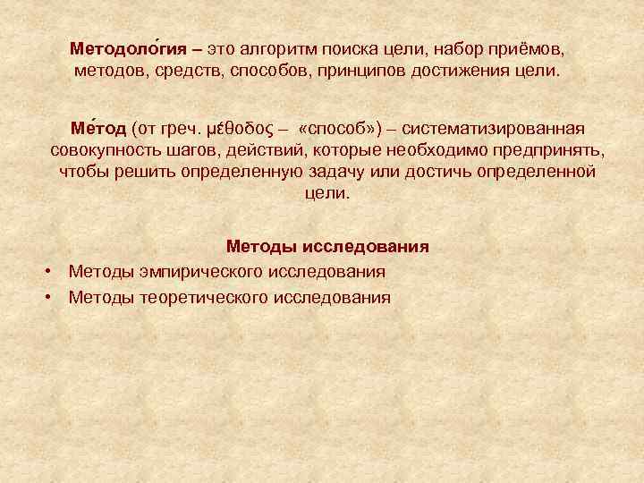 Методоло гия – это алгоритм поиска цели, набор приёмов, методов, средств, способов, принципов достижения цели. Ме тод (от греч. μέθοδος – «способ» ) – систематизированная совокупность шагов, действий, которые необходимо предпринять, чтобы решить определенную задачу или достичь определенной цели. Методы исследования • Методы эмпирического исследования • Методы теоретического исследования