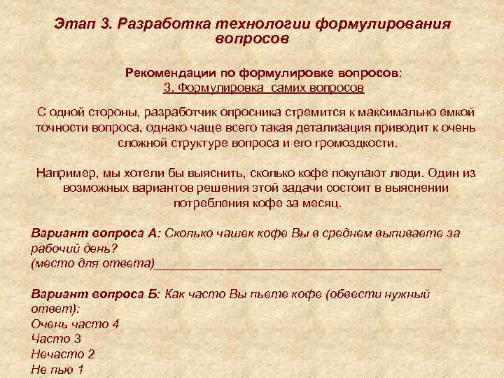 Этап 3. Разработка технологии формулирования вопросов Рекомендации по формулировке вопросов: 3. Формулировка самих вопросов С одной стороны, разработчик опросника стремится к максимально емкой точности вопроса, однако чаще всего такая детализация приводит к очень сложной структуре вопроса и его громоздкости. Например, мы хотели бы выяснить, сколько кофе покупают люди. Один из возможных вариантов решения этой задачи состоит в выяснении потребления кофе за месяц. Вариант вопроса А: Сколько чашек кофе Вы в среднем выпиваете за рабочий день? (место для ответа)_____________________ Вариант вопроса Б: Как часто Вы пьете кофе (обвести нужный ответ): Очень часто 4 Часто 3 Нечасто 2 Не пью 1