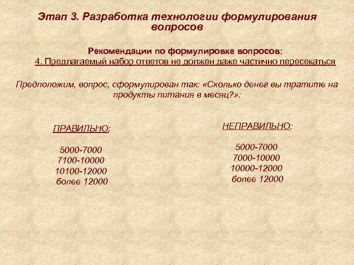 Этап 3. Разработка технологии формулирования вопросов Рекомендации по формулировке вопросов: 4. Предлагаемый набор ответов не должен даже частично пересекаться Предположим, вопрос, сформулирован так: «Сколько денег вы тратите на продукты питания в месяц? » : ПРАВИЛЬНО: НЕПРАВИЛЬНО: 5000 -7000 7100 -10000 10100 -12000 более 12000 5000 -7000 -10000 -12000 более 12000