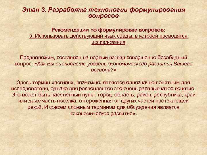 Этап 3. Разработка технологии формулирования вопросов Рекомендации по формулировке вопросов: 5. Использовать действующий язык среды, в которой проводятся исследования Предположим, составлен на первый взгляд совершенно безобидный вопрос: «Как Вы оцениваете уровень экономического развития Вашего региона? » Здесь термин «регион» , возможно, является однозначно понятным для исследователя, однако для респондентов это очень расплывчатое понятие. Это может быть населенный пункт, город, область, район, республика, край или даже часть поселка, отгороженная от других частей протекающей рекой. И совсем сложным термином для обсуждения является «экономическое развитие» .