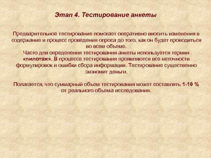 Этап 4. Тестирование анкеты Предварительное тестирование помогает оперативно вносить изменения в содержание и процесс проведения опроса до того, как он будет проводиться во всем объеме. Часто для определения тестирования анкеты используется термин «пилотаж» . В процессе тестирования проявляются все неточности формулировок и ошибки сбора информации. Тестирование существенно экономит деньги. Полагается, что суммарный объем тестирования может составлять 1 -10 % от реального объема исследования.
