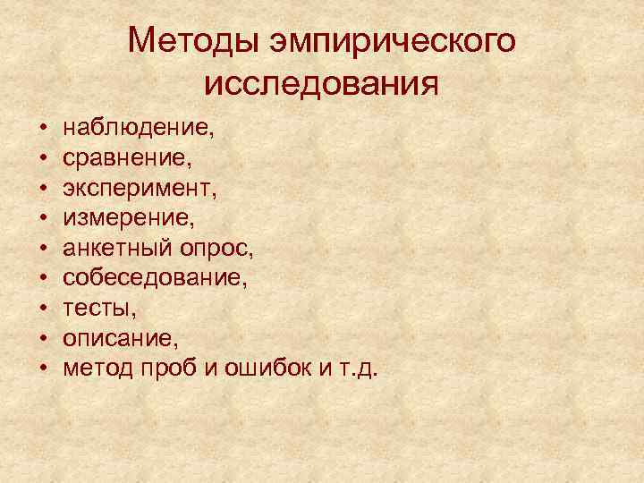 Методы эмпирического исследования • • • наблюдение, сравнение, эксперимент, измерение, анкетный опрос, собеседование, тесты, описание, метод проб и ошибок и т. д.