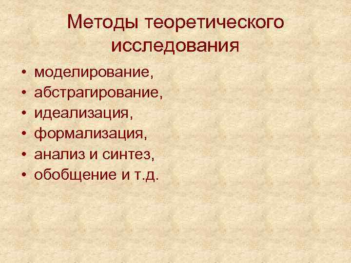 Методы теоретического исследования • • • моделирование, абстрагирование, идеализация, формализация, анализ и синтез, обобщение и т. д.