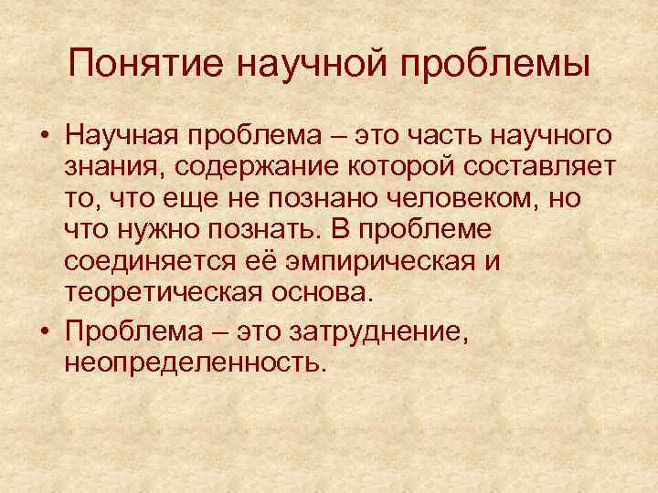 Понятие научной проблемы • Научная проблема – это часть научного знания, содержание которой составляет то, что еще не познано человеком, но что нужно познать. В проблеме соединяется её эмпирическая и теоретическая основа. • Проблема – это затруднение, неопределенность.