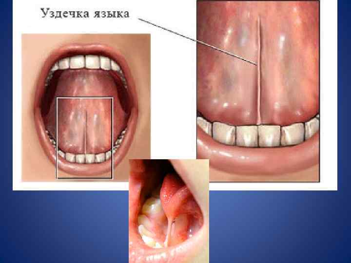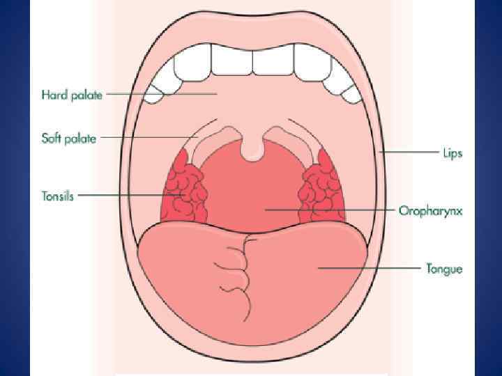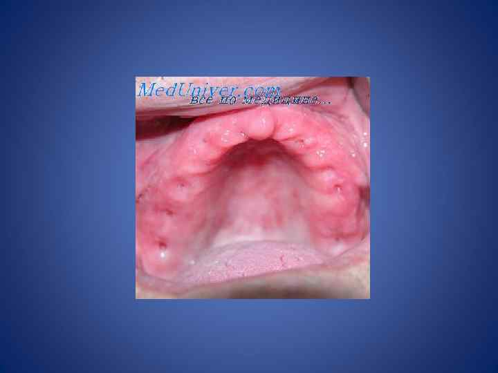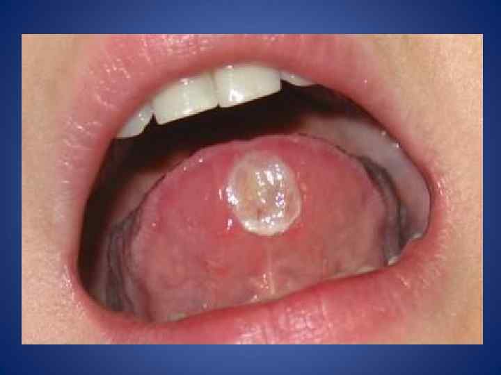 • Осмотр собственно полости рта • При осмотре дна полости рта обращают внимание на слизистую оболочку: наличие складок, уздечки языка, наличие выводных протоков подчелюстной и подъязычной слюнных желез. • Далее осматривают твердое небо. Слизистая неба твердая. В переднем отделе – поперечные складки, видные точечные отверстия МСЖ. • Мягкое небо заканчивается небными дужками и язычком. • Важное значение имеет наличие патологических образований на слизистой оболочке (пятно, узел, афта, язва, эрозия, пузырь и др. ), которыми сопровождаются стоматиты