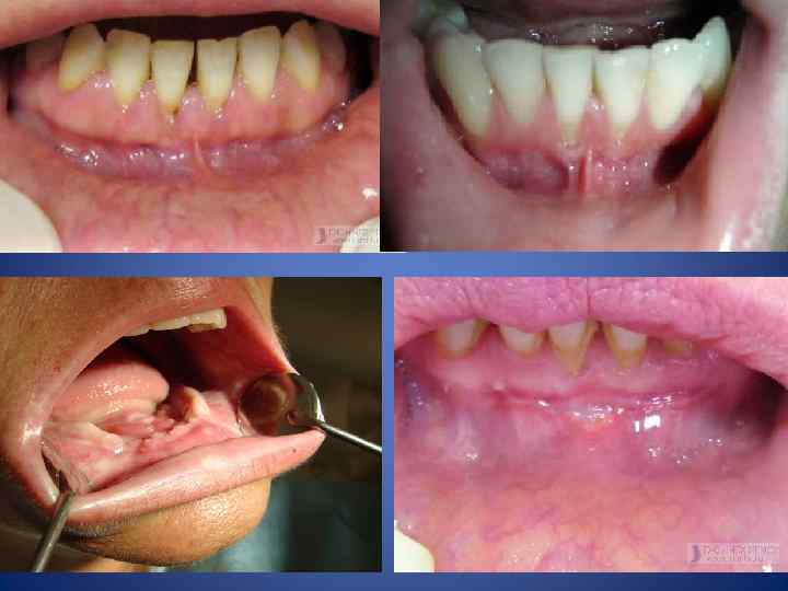 Осмотр преддверия полости рта Состояние слизистой губ, щек, десен • Синюшность, • отечность, • гипертрофия, • гнойные выделения, • Наличие припухлостей • Уплотнение • Пролежни