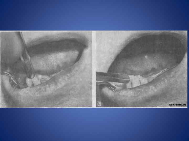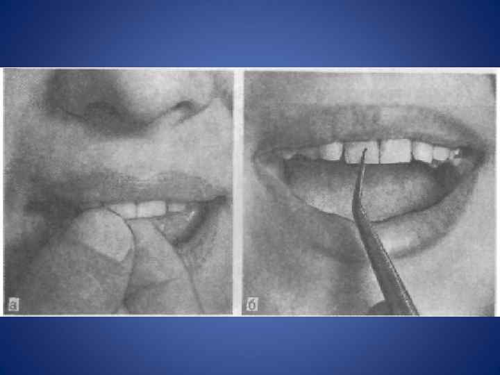 Объективное обследование • Осмотр полости рта начинают с преддверия рта при сомкнутых челюстях и расслабленных губах, подняв верхнюю и оттянув нижнюю с помощью стоматологического зеркала
