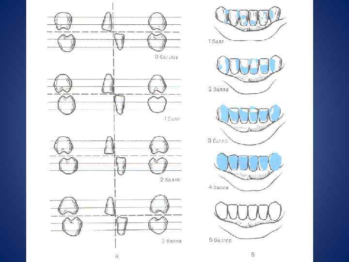Индексы гигиены полости рта Индекс гигиены по Федорова-Володкиной (1971) • Раствором Шиллера-Писарева смазывают вестибулярные поверхности нижних фронтальных зубов. В зависимости от количества налета поверхность зуба окрашивается с разной интенсивностью. Количественную оценку проводят по пятибальной системе: • 1 балл - коронка не окрашивается; • 2 балла - окрашивается 1/4 поверхности коронки; • 3 балла - окрашивается 1/2 поверхности; • 4 балла - окрашивается 3/4 поверхности; • 5 баллов - окрашивается вся коронка. • Расчет производят по формуле: Кср. = сумма показателей • количество зубов (6) • • В норме гигиенический индекс не должен превышать 1, 1 -1, 3 балла.