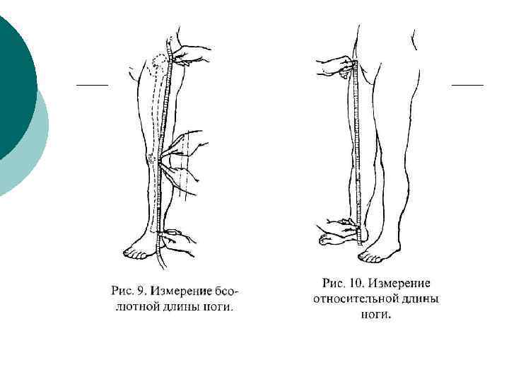 Измерение длины нижней конечности: - больного укладывают на спину, конечностям придают симметричное положение, параллельное длинной оси тела, при этом передние верхние ости подвздошных костей находятся на одной линии , перпендикулярной к длинной оси тела. ¡ Анатомическая длина бедра- от вершины большого вертела до суставной щели коленного сустава. Голени- от суставной щели коленного сустава до наружной лодыжки. Суммаанатомическая длина нижней конечности. ¡ Относительная длина- от передневерхней ости крыла до внутренней лодыжки. ¡