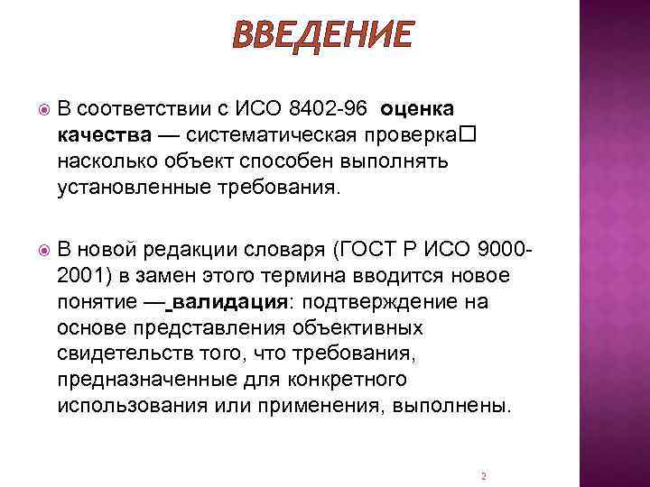 ВВЕДЕНИЕ В соответствии с ИСО 8402 -96 оценка качества — систематическая проверка насколько объект способен выполнять установленные требования. В новой редакции словаря (ГОСТ Р ИСО 90002001) в замен этого термина вводится новое понятие — валидация: подтверждение на основе представления объективных свидетельств того, что требования, предназначенные для конкретного использования или применения, выполнены. 2