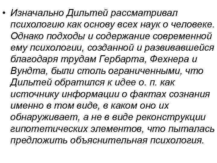• Изначально Дильтей рассматривал психологию как основу всех наук о человеке. Однако подходы и содержание современной ему психологии, созданной и развивавшейся благодаря трудам Гербарта, Фехнера и Вундта, были столь ограниченными, что Дильтей обратился к идее о. п. как источнику информации о фактах сознания именно в том виде, в каком оно их обнаруживает, а не в виде реконструкции гипотетических элементов, что пыталась предложить объяснительная психология.