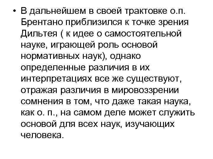 • В дальнейшем в своей трактовке о. п. Брентано приблизился к точке зрения Дильтея ( к идее о самостоятельной науке, играющей роль основой нормативных наук), однако определенные различия в их интерпретациях все же существуют, отражая различия в мировоззрении сомнения в том, что даже такая наука, как о. п. , на самом деле может служить основой для всех наук, изучающих человека.