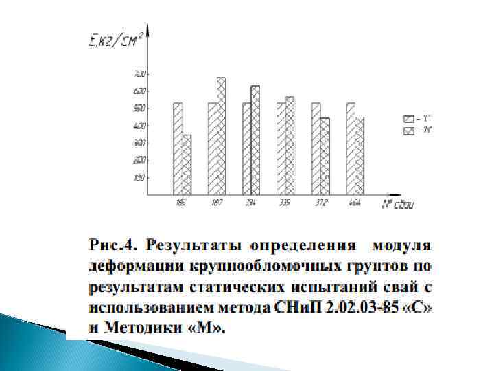 Результаты определения мод уля деформации крупнооблом очных грунтов по результатам статических испытаний свай с использованием метода СНи. П 2. 0385 «Свайные фундаменты» и «Методика обоснования проч ностных и деформативных ха рактеристик крупнообломочн ых грунтов Крыма по данным оп ределения их физических сво йств» представлены на рис. 4.