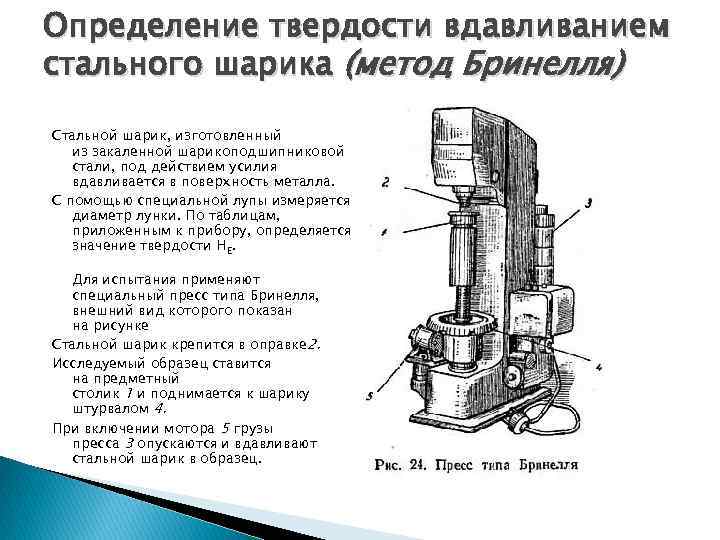 Определение твердости вдавливанием стального шарика (метод Бринелля) Стальной шарик, изготовленный из закаленной шарикоподшипниковой стали, под действием усилия вдавливается в поверхность металла. С помощью специальной лупы измеряется диаметр лунки. По таблицам, приложенным к прибору, определяется значение твердости НЕ. Для испытания применяют специальный пресс типа Бринелля, внешний вид которого показан на рисунке Стальной шарик крепится в оправке 2. Исследуемый образец ставится на предметный столик 1 и поднимается к шарику штурвалом 4. При включении мотора 5 грузы пресса 3 опускаются и вдавливают стальной шарик в образец.
