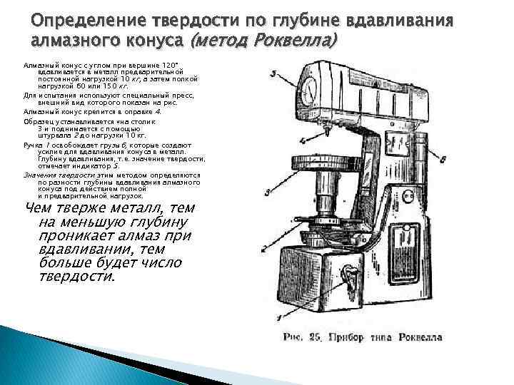 Определение твердости по глубине вдавливания алмазного конуса (метод Роквелла) Алмазный конус с углом при вершине 120° вдавливается в металл предварительной постоянной нагрузкой 10 кг, а затем полкой нагрузкой 60 или 150 кг. Для испытания используют специальный пресс, внешний вид которого показан на рис. Алмазный конус крепится в оправке 4. Образец устанавливается «на столик 3 и поднимается с помощью штурвала 2 до нагрузки 10 кг. Ручка 1 освобождает грузы6, которые создают усилие для вдавливания конуса в металл. Глубину вдавливания, т. е. значение твердости, отмечает индикатор 5. Значения твердости этим методом определяются по разности глубины вдавливания алмазного конуса под действием полной и предварительной нагрузок. Чем тверже металл, тем на меньшую глубину проникает алмаз при вдавливании, тем больше будет число твердости.