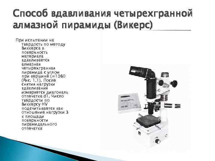 Способ вдавливания четырехгранной алмазной пирамиды (Викерс) При испытании на твердость по методу Виккерса в поверхность материала вдавливается алмазная четырехгранная пирамида с углом при вершине (=1360 (Рис. 1. 1). После снятия нагрузки вдавливания измеряется диагональ отпечатка d 1. Число твердости по Виккерсу HV подсчитывается как отношение нагрузки З к площади поверхности пирамидального отпечатка