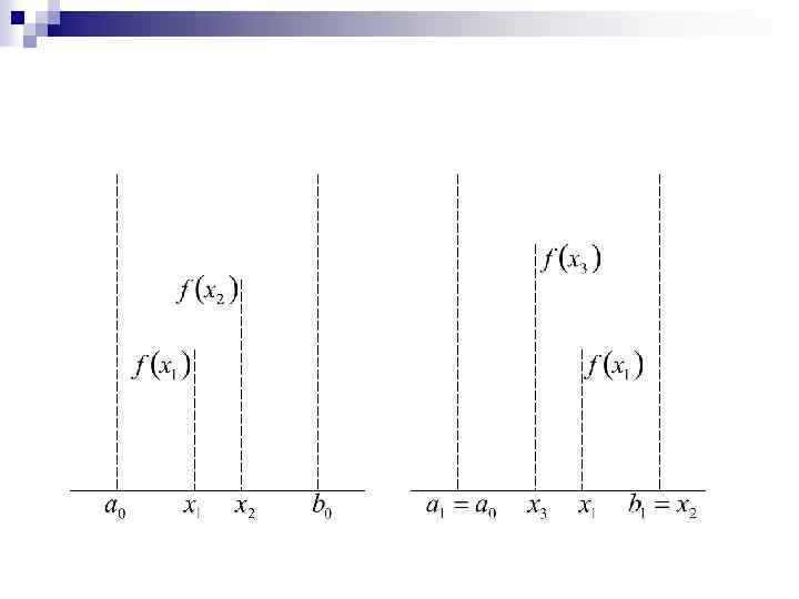 Поскольку нас интересует только положительное решение, Очевидно, что интервал неопределенности можно разделить в соотношении золотого сечения двояко: в пропорциях : и В данном случае имеем Аналогично, :