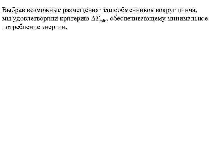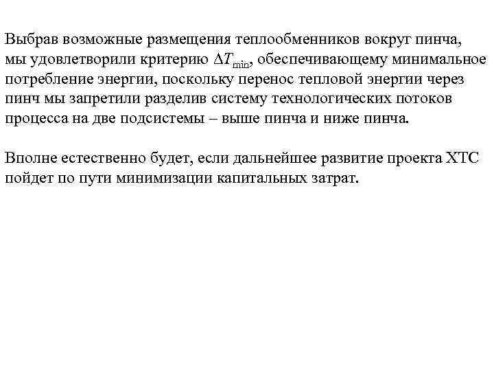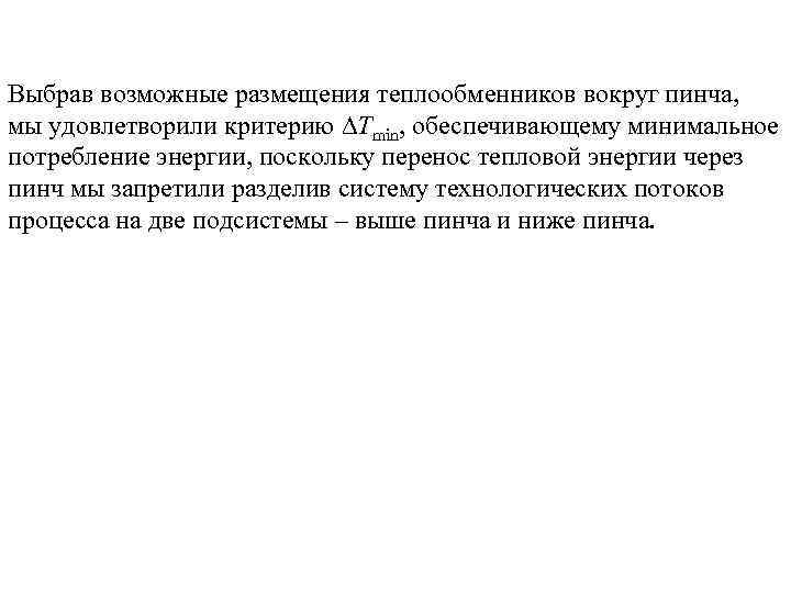 Выбрав возможные размещения теплообменников вокруг пинча, мы удовлетворили критерию Тmin, обеспечивающему минимальное потребление энергии,