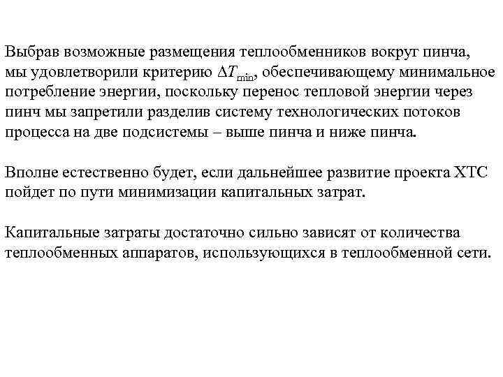 Выбрав возможные размещения теплообменников вокруг пинча, мы удовлетворили критерию Тmin, обеспечивающему минимальное потребление энергии, поскольку перенос тепловой энергии через пинч мы запретили разделив систему технологических потоков процесса на две подсистемы – выше пинча и ниже пинча. Вполне естественно будет, если дальнейшее развитие проекта ХТС пойдет по пути минимизации капитальных затрат.