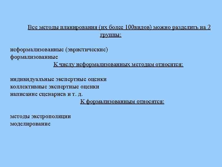 Все методы планирования (их более 100 видов) можно разделить на 2 группы: неформализованные (эвристические) формализованные К числу неформализованных методам относятся: индивидуальные экспертные оценки коллективные экспертные оценки написание сценариев и т. д. К формализованным относятся: методы экстрополяции моделирование