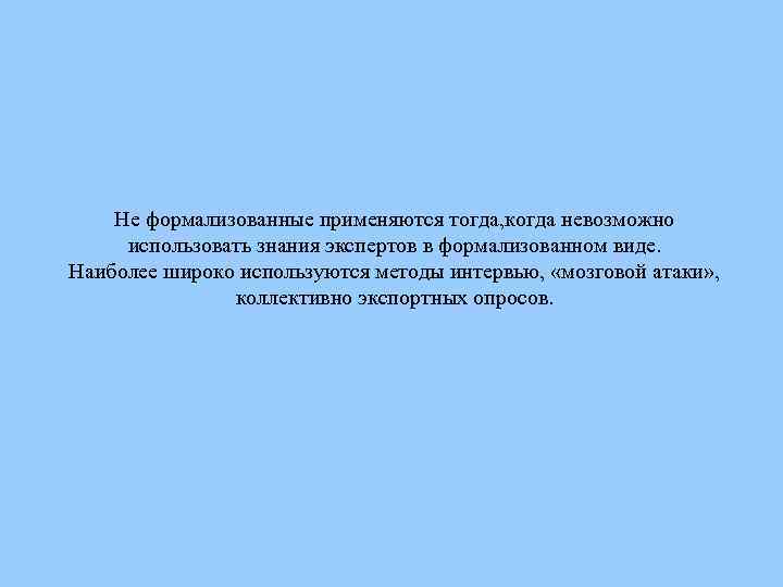 Не формализованные применяются тогда, когда невозможно использовать знания экспертов в формализованном виде. Наиболее широко используются методы интервью, «мозговой атаки» , коллективно экспортных опросов.