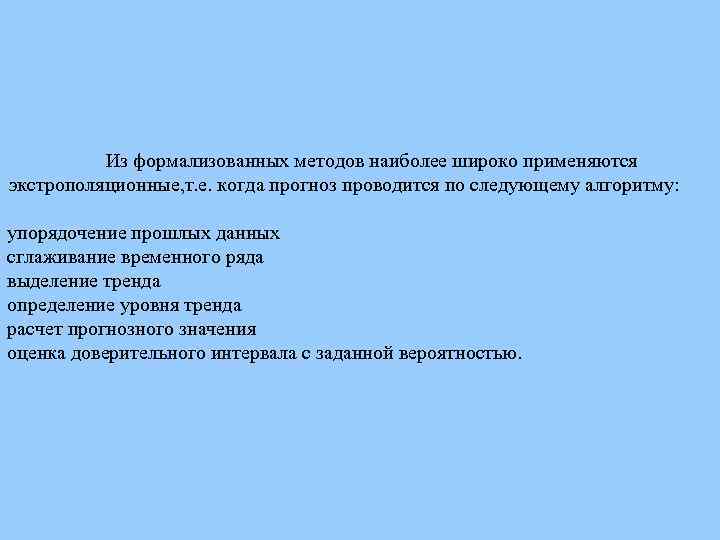 Из формализованных методов наиболее широко применяются экстрополяционные, т. е. когда прогноз проводится по следующему алгоритму: упорядочение прошлых данных сглаживание временного ряда выделение тренда определение уровня тренда расчет прогнозного значения оценка доверительного интервала с заданной вероятностью.