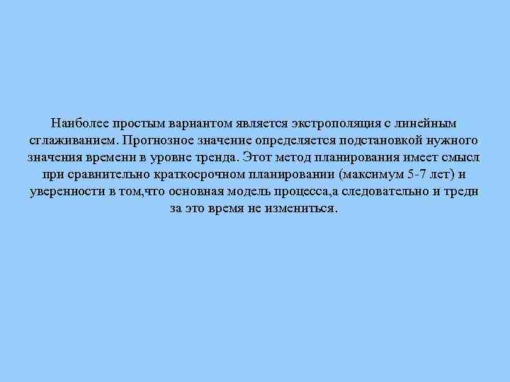 Наиболее простым вариантом является экстрополяция с линейным сглаживанием. Прогнозное значение определяется подстановкой нужного значения времени в уровне тренда. Этот метод планирования имеет смысл при сравнительно краткосрочном планировании (максимум 5 -7 лет) и уверенности в том, что основная модель процесса, а следовательно и тредн за это время не измениться.