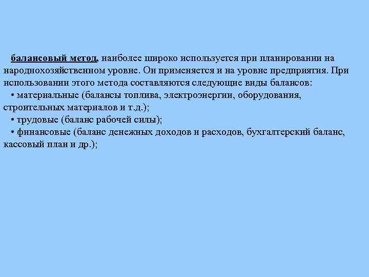 балансовый метод, наиболее широко используется при планировании на народнохозяйственном уровне. Он применяется и на уровне предприятия. При использовании этого метода составляются следующие виды балансов: • материальные (балансы топлива, электроэнергии, оборудования, строительных материалов и т. д. ); • трудовые (баланс рабочей силы); • финансовые (баланс денежных доходов и расходов, бухгалтерский баланс, кассовый план и др. );