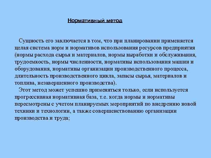 Нормативный метод Сущность его заключается в том, что при планировании применяется целая система норм и нормативов использования ресурсов предприятия (нормы расхода сырья и материалов, нормы выработки и обслуживания, трудоемкость, нормы численности, нормативы использования машин и оборудования, нормативы организации производственного процесса, длительность производственного цикла, запасы сырья, материалов и топлива, незавершенного производства). Этот метод может успешно применяться только, если используется прогрессивная нормативная база, т. е. когда нормы и нормативы пересмотрены с учетом планируемых мероприятий по внедрению новой техники и технологии, а также совершенствованию организации производства и труда;