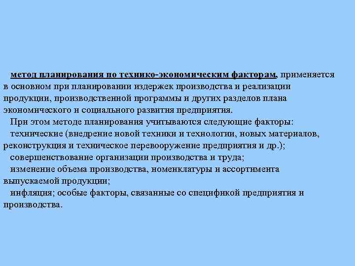 метод планирования по технико-экономическим факторам, применяется в основном при планировании издержек производства и реализации продукции, производственной программы и других разделов плана экономического и социального развития предприятия. При этом методе планирования учитываются следующие факторы: технические (внедрение новой техники и технологии, новых материалов, реконструкция и техническое перевооружение предприятия и др. ); совершенствование организации производства и труда; изменение объема производства, номенклатуры и ассортимента выпускаемой продукции; инфляция; особые факторы, связанные со спецификой предприятия и производства.