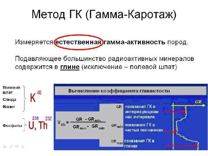 Резюме: ГК v v v Естественная гамма-активность связана с содержанием U, Th, K сконцентрированы в глинах Показания в глинах увеличиваются, в песчаниках – уменьшаются Лучший индикатор глинистости ГК спектрометрический выделяет из общего сигнала отдельные вклады U, Th, K. Улучшает оценку глинистости v Глубинность - 10 -15 см. v ГК измеряет естественную радиоактивность и линеен для каждого радиоактивного минерала. Криволинейные связи с другим индикатором глинистости Vshale является показателем наличия как минимум двух радиоактивных минералов в пласте в различных пропорциях. v Th/K (торий/калиевое) отношение гамма-спектрометрического каротажа (NGT) является индикатором наличия глин и минеральных изменений в пласте, но не является абсолютным показателем типа глин.