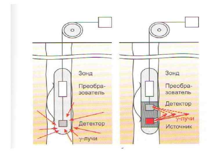 Гамма-гамма-каротаж • Гамма-гамма-каротаж (ГГК) заключается в облучении горных пород γ -квантами искусственного источника и измерении рассеянного γ -излучения. • Аппаратура ГГК устроена так же, как и аппаратура ГК, но скважинный снаряд дополняется источником γ-квантов. • Расстояние между центрами детектора и источника называется длиной зонда. • Чтобы прямое γ -излучение источника не попадало на детектор, между ними помещают свинцовый экран. • Поскольку рассеянное излучение имеет более низкую энергию, чем прямое, то для уменьшения его поглощения в буровом растворе детектор γ -квантов так же, как и источник, прижимают к стенке скважины. • Для уменьшения влияния кавернозности скважин и детектор, и источник могут быть размещены в небольшом выносном блоке, прижимаемом к стенке скважины и способном заходить в каверны.