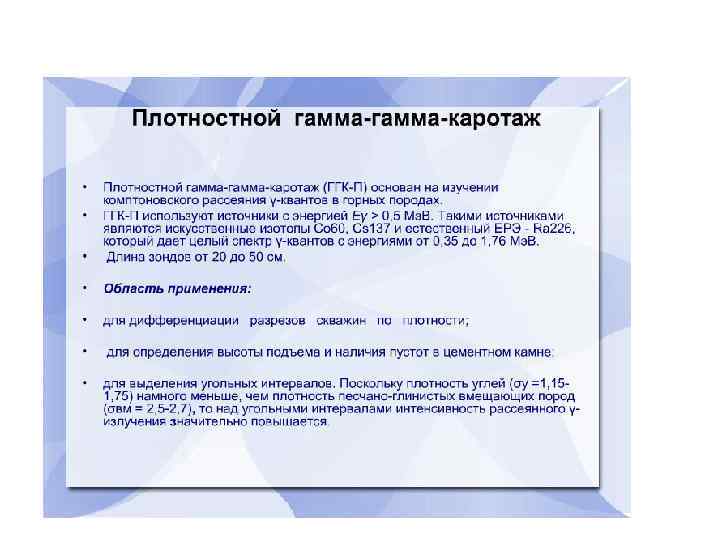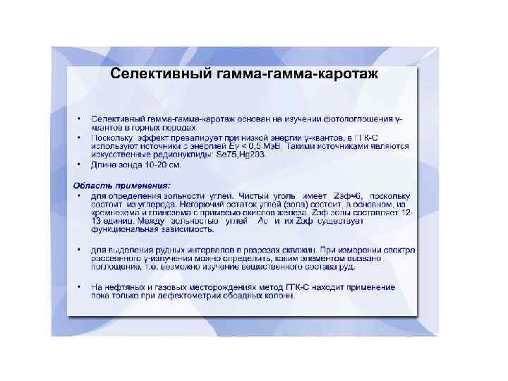 ГМ применяют для решения следующих задач: • Расчленения и корреляции осадочных толщ по степени их глинистости; • Выделения коллекторов нефти, газа и пресных вод, залегающих среди глинистых вмещающих пород; • Оценки коллекторских свойств, зависящих от глинистости пород. • ГМ-С применяют для корреляции «немых» толщ, а также для детального литологического расчленения осадочных пород в тех случаях, когда их радиоактивность не связана с глинистостью.