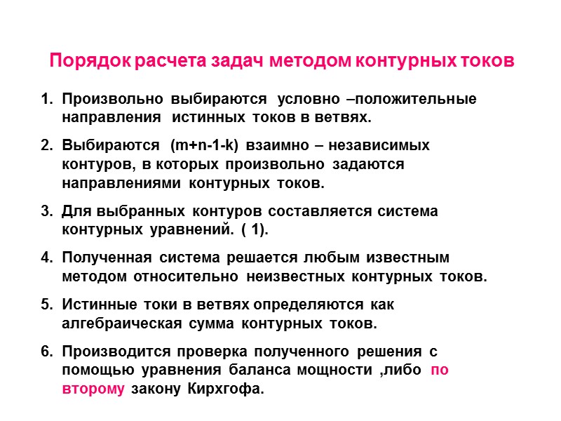 Порядок расчета задач методом контурных токов Произвольно выбираются условно –положительные направления истинных токов в ветвях. Выбираются (m+n-1-k) взаимно – независимых контуров, в которых произвольно задаются направлениями контурных токов. Для выбранных контуров составляется система контурных уравнений. ( 1). Полученная система решается любым известным методом относительно неизвестных контурных токов. Истинные токи в ветвях определяются как алгебраическая сумма контурных токов. Производится проверка полученного решения с помощью уравнения баланса мощности ,либо по второму закону Кирхгофа.