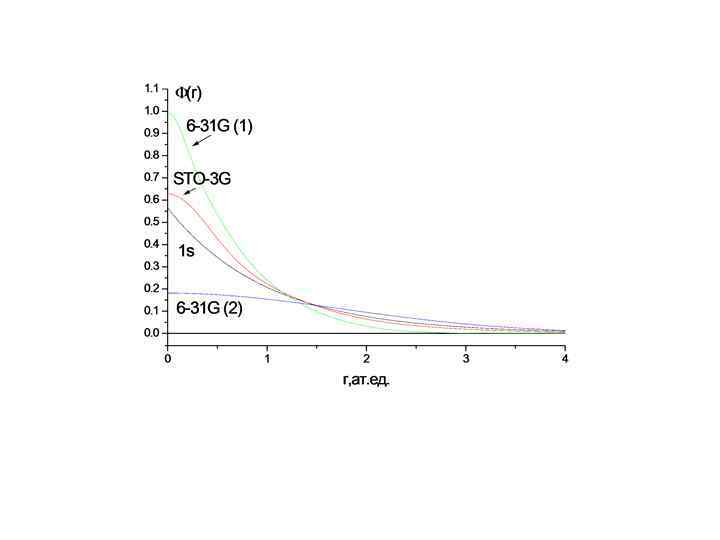 Что дает расчет • Расчет для атома водорода с функцией STO-3 G дает значение энергии, равное – 0. 466582 ат. ед. (ошибка 6. 6%, правильное значение - – 0. 5 ат. ед. ). В расчете в базисе 6 -31 G (энергия – – 0. 498233 ат. ед. , ошибка – 0. 35 %) коэффициенты при 6 -31 G (1) и 631 G (2) равны, соответственно, 0. 427431 и 0. 665449. Ошибка в расчете энергии определяется прежде всего ходом функций при малых расстояниях от ядра.