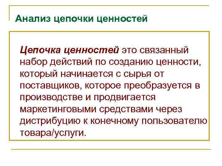 Анализ цепочки ценностей Цепочка ценностей это связанный набор действий по созданию ценности, который начинается с сырья от поставщиков, которое преобразуется в производстве и продвигается маркетинговыми средствами через дистрибуцию к конечному пользователю товара/услуги.