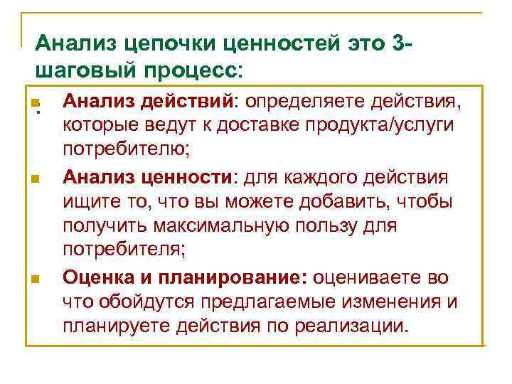 Анализ цепочки ценностей это 3 - шаговый процесс: n : Анализ действий: определяете действия, которые ведут к доставке продукта/услуги потребителю; n Анализ ценности: для каждого действия ищите то, что вы можете добавить, чтобы получить максимальную пользу для потребителя; n Оценка и планирование: оцениваете во что обойдутся предлагаемые изменения и планируете действия по реализации.