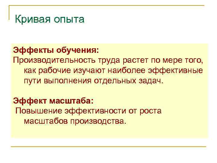Кривая опыта Эффекты обучения: Производительность труда растет по мере того, как рабочие изучают наиболее эффективные пути выполнения отдельных задач. Эффект масштаба: Повышение эффективности от роста масштабов производства.