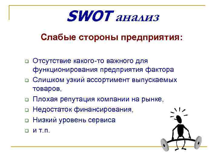 SWOT анализ Слабые стороны предприятия: q Отсутствие какого-то важного для функционирования предприятия фактора q Слишком узкий ассортимент выпускаемых товаров, q Плохая репутация компании на рынке, q Недостаток финансирования, q Низкий уровень сервиса q и т. п.