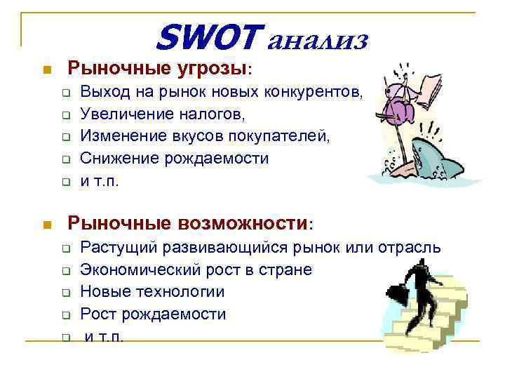 SWOT анализ n Рыночные угрозы: q Выход на рынок новых конкурентов, q Увеличение налогов, q Изменение вкусов покупателей, q Снижение рождаемости q и т. п. n Рыночные возможности: q Растущий развивающийся рынок или отрасль q Экономический рост в стране q Новые технологии q Рост рождаемости q и т. п.