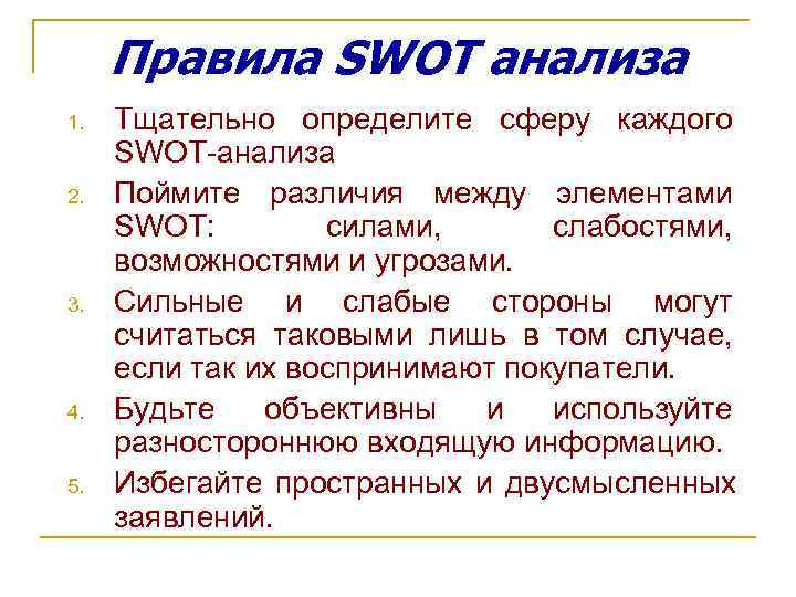 Правила SWOT анализа 1. Тщательно определите сферу каждого SWOT-анализа 2. Поймите различия между элементами SWOT: силами, слабостями, возможностями и угрозами. 3. Сильные и слабые стороны могут считаться таковыми лишь в том случае, если так их воспринимают покупатели. 4. Будьте объективны и используйте разностороннюю входящую информацию. 5. Избегайте пространных и двусмысленных заявлений.