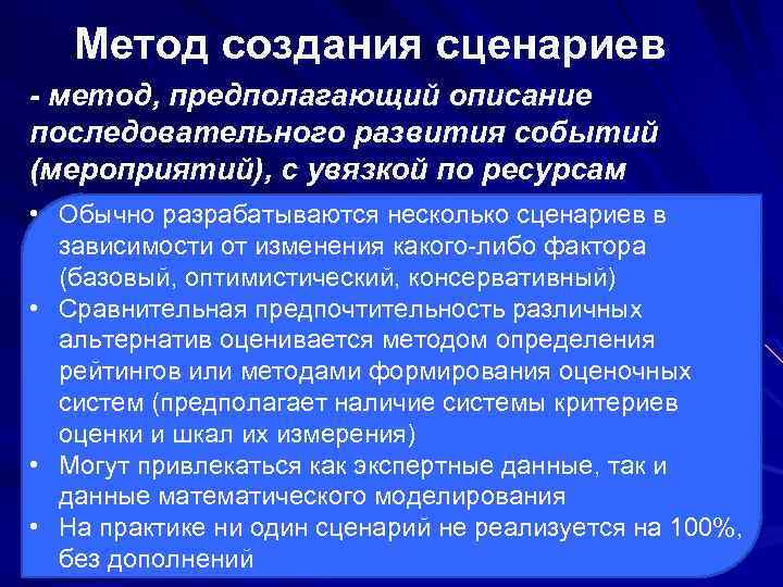 Метод создания сценариев - метод, предполагающий описание последовательного развития событий (мероприятий), с увязкой по ресурсам • Обычно разрабатываются несколько сценариев в зависимости от изменения какого-либо фактора (базовый, оптимистический, консервативный) • Сравнительная предпочтительность различных альтернатив оценивается методом определения рейтингов или методами формирования оценочных систем (предполагает наличие системы критериев оценки и шкал их измерения) • Могут привлекаться как экспертные данные, так и данные математического моделирования • На практике ни один сценарий не реализуется на 100%, без дополнений