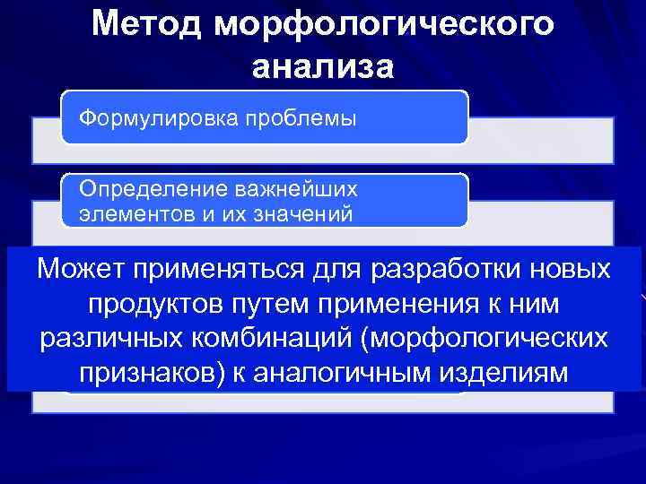 Метод морфологического анализа Формулировка проблемы Определение важнейших элементов и их значений Может применяться для разработки новых Составление морфологической матрицы продуктов путем применения к ним различных комбинаций (морфологических Оценка всех имеющихся признаков) к аналогичным изделиям вариантов и выбор оптимального