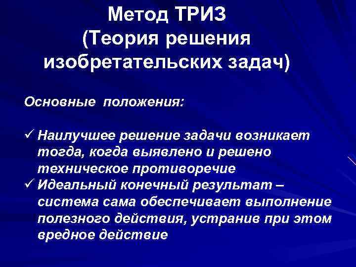 Метод ТРИЗ (Теория решения изобретательских задач) Основные положения: ü Наилучшее решение задачи возникает тогда, когда выявлено и решено техническое противоречие ü Идеальный конечный результат – система сама обеспечивает выполнение полезного действия, устранив при этом вредное действие