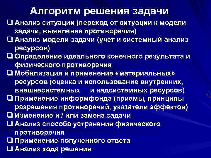 Алгоритм решения задачи q Анализ ситуации (переход от ситуации к модели задачи, выявление противоречия) q Анализ модели задачи (учет и системный анализ ресурсов) q Определение идеального конечного результата и физического противоречия q Мобилизация и применение «материальных» ресурсов (оценка и использование внутренних, внешнесистемных и надсистемных ресурсов) q Применение информфонда (приемы, принципы разрешения противоречий, указатели эффектов) q Изменение и / или замена задачи q Анализ способа устранения физического противоречия q Применение полученного ответа q Анализ хода решения