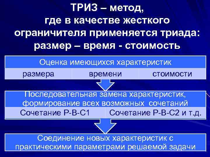 ТРИЗ – метод, где в качестве жесткого ограничителя применяется триада: размер – время - стоимость Оценка имеющихся характеристик размера времени стоимости Последовательная замена характеристик, формирование всех возможных сочетаний Сочетание Р-В-С 1 Сочетание Р-В-С 2 и т. д. Соединение новых характеристик с практическими параметрами решаемой задачи