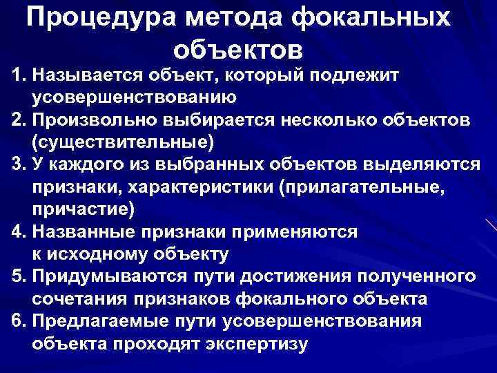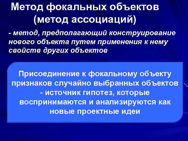 Метод фокальных объектов (метод ассоциаций) - метод, предполагающий конструирование нового объекта путем применения к нему свойств других объектов Присоединение к фокальному объекту признаков случайно выбранных объектов - источник гипотез, которые воспринимаются и анализируются как новые проектные идеи