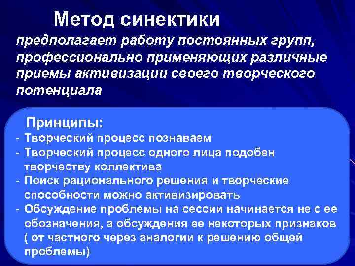 Метод синектики предполагает работу постоянных групп, профессионально применяющих различные приемы активизации своего творческого потенциала Принципы: - Творческий процесс познаваем - Творческий процесс одного лица подобен творчеству коллектива - Поиск рационального решения и творческие способности можно активизировать - Обсуждение проблемы на сессии начинается не с ее обозначения, а обсуждения ее некоторых признаков ( от частного через аналогии к решению общей проблемы)