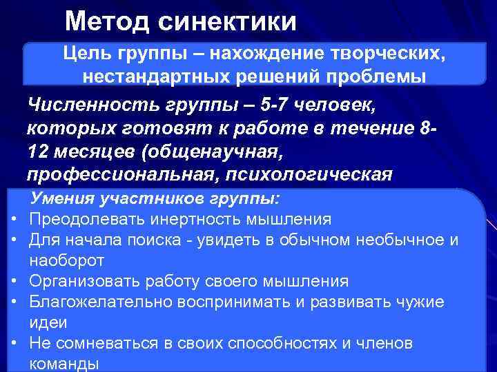 Метод синектики Цель группы – нахождение творческих, нестандартных решений проблемы Численность группы – 5 -7 человек, которых готовят к работе в течение 8 - 12 месяцев (общенаучная, профессиональная, психологическая подготовка) Умения участников группы: • Преодолевать инертность мышления • Для начала поиска - увидеть в обычном необычное и наоборот • Организовать работу своего мышления • Благожелательно воспринимать и развивать чужие идеи • Не сомневаться в своих способностях и членов команды