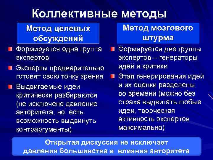 Коллективные методы Метод целевых Метод мозгового обсуждений штурма Формируется одна группа Формируется две группы экспертов экспертов – генераторы Эксперты предварительно идей и критики готовят свою точку зрения Этап генерирования идей Выдвигаемые идеи и их оценки разделены критически разбираются во времени (можно без (не исключено давление страха выдвигать любые авторитета, но есть идеи, творческая возможность выдвинуть активность экспертов контраргументы) максимальна) Открытая дискуссия не исключает давления большинства и влияния авторитета